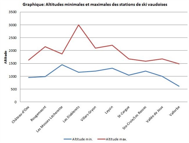 Depuis les années 2000 environ, la sécurité de l’enneigement dans le canton de Vaud, n’est plus garantie en dessous de 1200 mètres d’altitude et les spécialistes prévoient une diminution de 20 à 40% de la durée d’enneigement dans le Jura et les Préalpes d’ici 2030 – 2050 (Bader & Kunz 1999), si bien que d’ici 2050, la sécurité de l’enneigement ne sera plus garantie en dessous de 1500 mètres d’altitude (SLF 2007). Si cette évolution se confirme, de nombreux domaines skiables vaudois ne pourront plus être exploités, comme le montre le graphique ci-dessous.