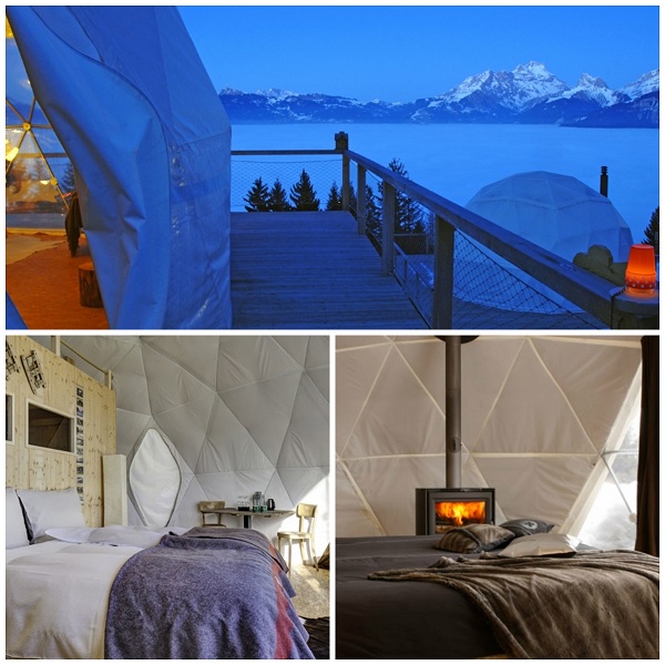 Photo: « Whitepod » aux Giettes, Bas-Valais. Vues intérieure et extérieure, au-dessus de la « mer de brouillard ». Source : www.whitepod.com/summer/