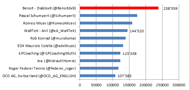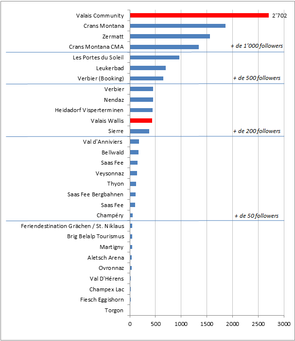 Dans cet article nous traiterons de la notoriété des destinations valaisannes en termes de « followers » sur Twitter (aussi appelés « suiveurs » ou « abonnés » en français). C’est-à-dire que nous avons réalisé des comparaisons en termes de personnes inscrites aux mises à jour des comptes Twitter des principales destinations valaisannes.