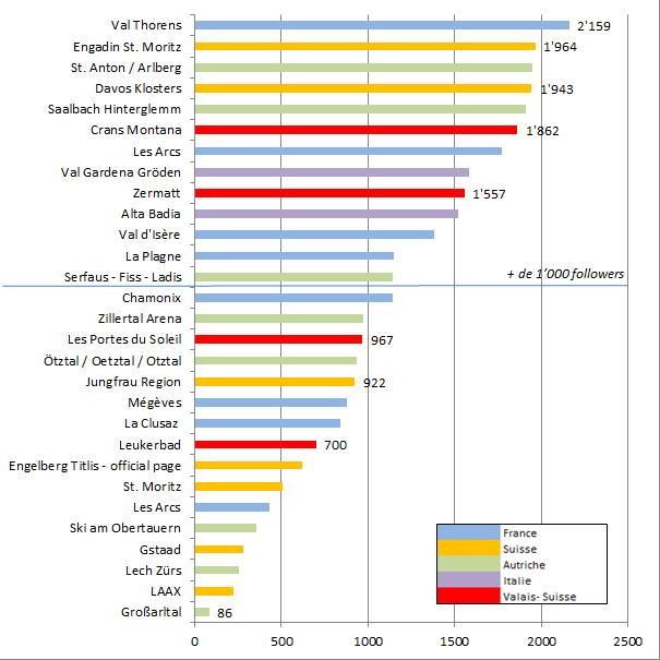 Valais Community (2’702 followers) n’a pas été ajouté à cette comparaison. Toutefois cette entité surpasse Val Thorens (2’159 followers) qui tient la tête de notre classement de destinations alpines.